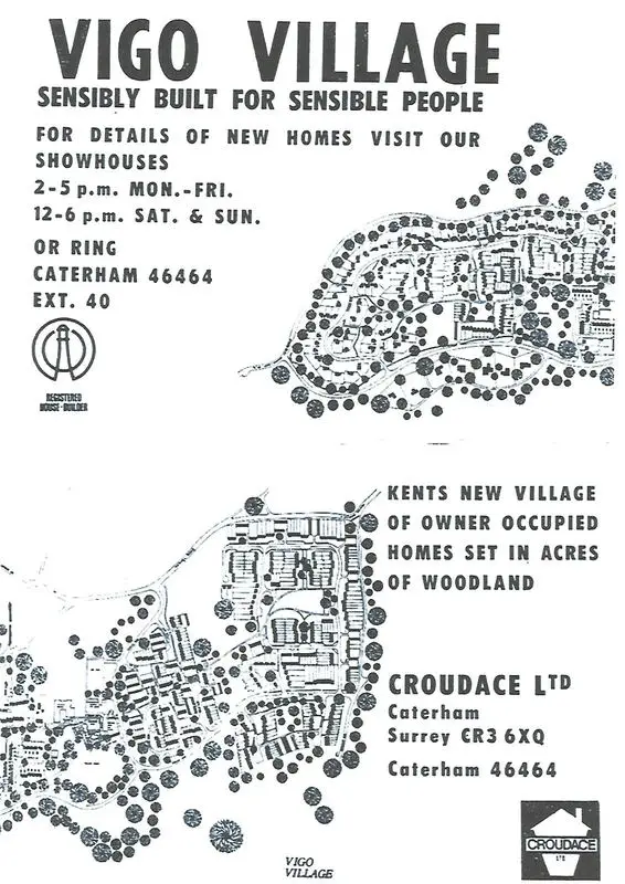 In 1964, Kent County Council bought the whole site, selling 150 acres to Trosley Country Park (officially opened in 1976) and 65 acres to an investment company associated with Croudace Ltd., who purchased the land for £65,000. Outline planning permission had been granted in 1962 with an original proposal which was to include 680 dwellings and 44 blocks of flats, 75 ft tall, but these were rejected. Final permission, with a much more environmentally friendly proposal, was granted in 1964 and the building of Vigo Village was begun.