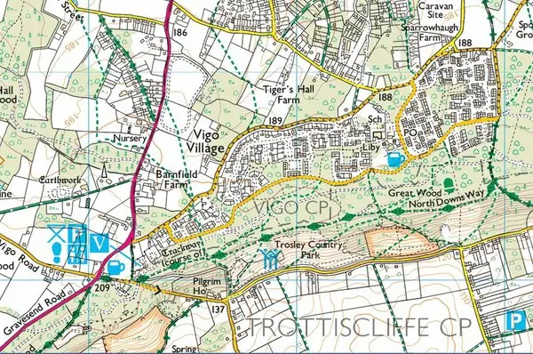 Vigo Village is a civil parish in the Borough of Gravesham, in Kent, England. The civil parish was created in 2000. The village is situated in the middle of chestnut woodland at the top of the North Downs, east of the road between Gravesend and Wrotham. Adjacent to the village is Trosley Country Park which forms part of the North Downs Area of Outstanding Natural Beauty. In the 2001 census, Vigo civil parish had a population of 2,201, reducing to 2,065 in the 2011 Census.