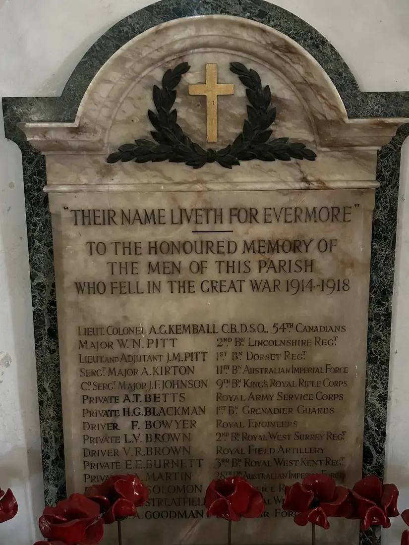 In the Parish Church of St. Mary, there is a fine alabaster tablet outlined in green marble which lists the names and Regiments of 15 men who served overseas during WW1 and lost their lives. This tablet was unveiled on 10th March 1920 by Colonel William Pitt of Fairseat, who had lost two sons in the conflict. The names on the tablet were subsequently engraved on the Stansted War Memorial, which was unveiled three years later, on 15th July 1923.