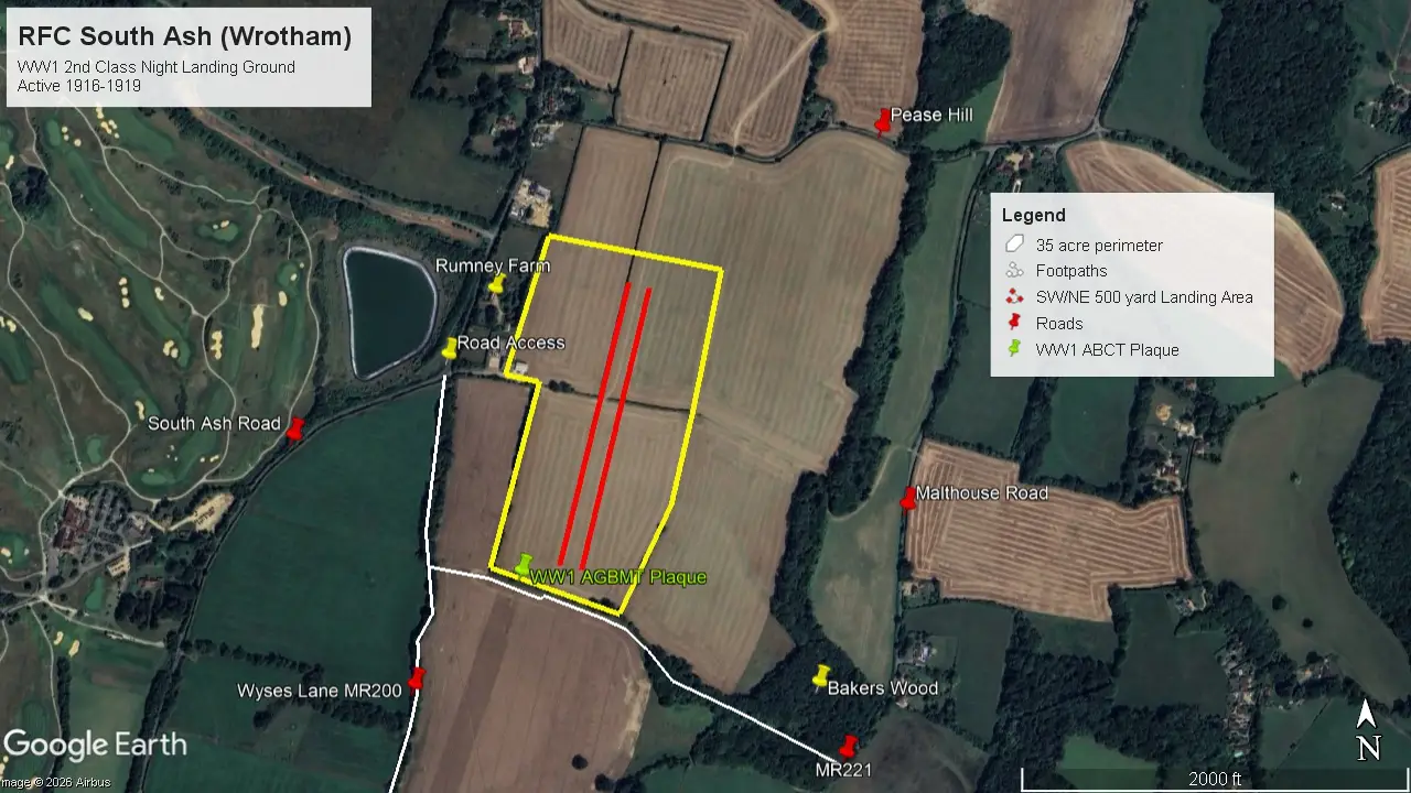 As a 2nd Class Night Landing Ground, South Ash only ever accommodated a single flight of two or three aircraft, with the other Squadron flights dispersed elsewhere. (The suffix of Wrotham was probably to prevent confusion with Ash near Canterbury.)