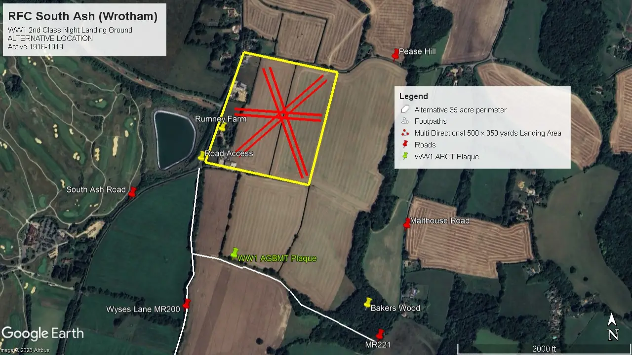 The area bounded by the yellow line is exactly 35 acres. The access road to the current industrial warehouses at the junction of Wyses Lane and South Ash Road is approximately 4 miles from Longfield station, whilst the two red parallel lines represent the take-off and landing minimum run of 500 yards into the prevailing wind direction. (N.B This predominant SW/NE directional runway alignment can also still be seen at the other North Downs airfields of Kenley, Biggin Hill, Romney Street and Rochester.)