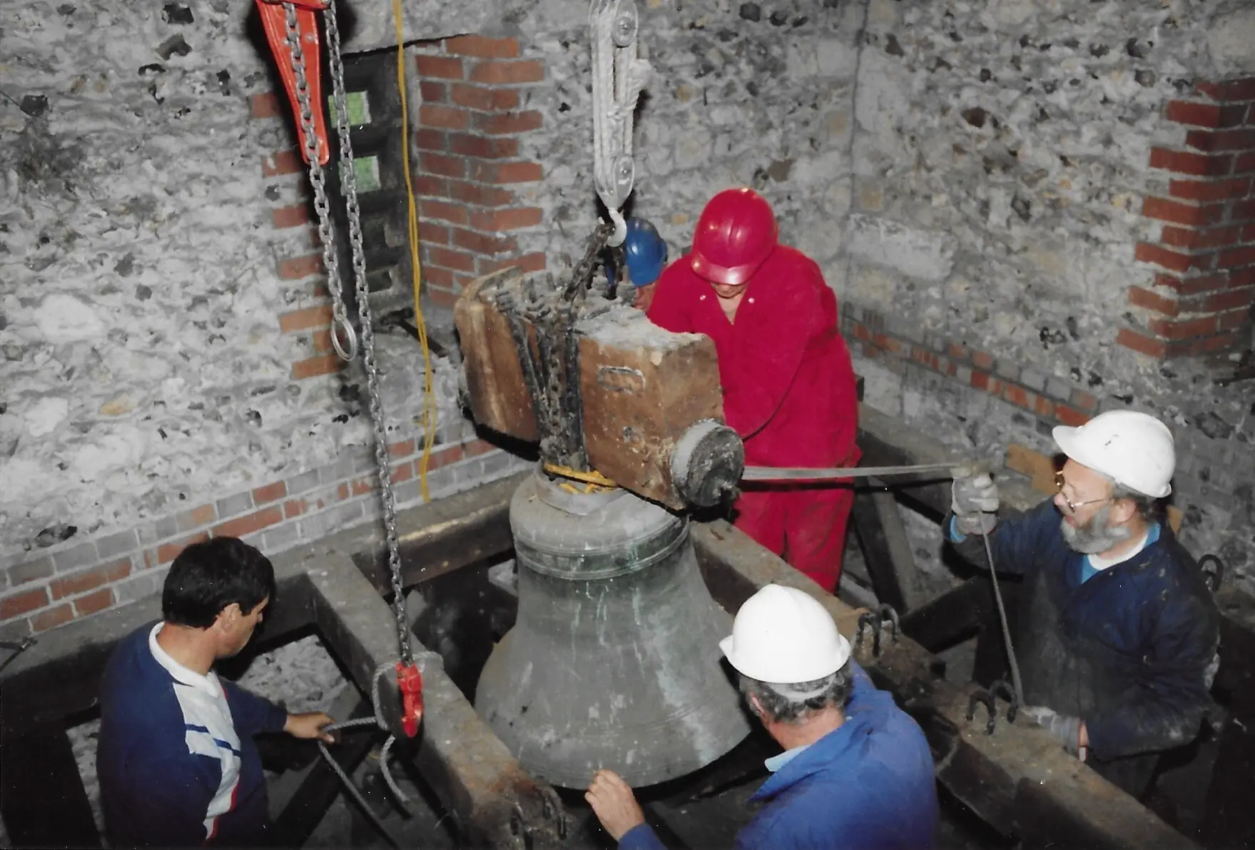 On 9th June 1991 one hundred and fifty intrepid walkers accompanied the oldest bell in St Mary’s tower to Whitechapel Bell Foundry, a distance of 26 miles.  Dressed in medieval costume they raised a quarter of the funds needed for a new bell frame, ringing gallery, and the casting of three new bells to create a ring of six.