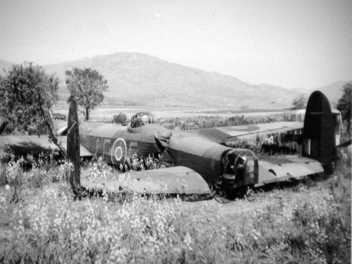 ‘Blue’ Rackley’s crashed Lancaster at the end of the Borgo airfield runway in Corsica. Image courtesy of The Australians at War Film Archive.