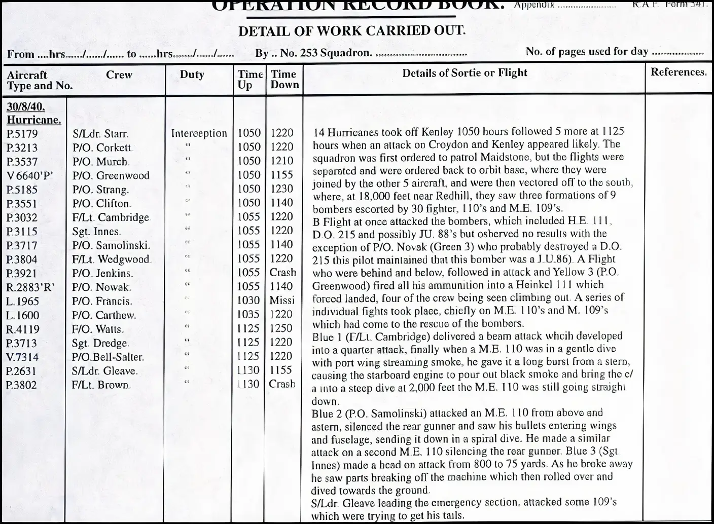 Whilst Gleave, Brown and Francis were dogfighting over Stansted, the remainder of the Squadron had been vectored to Redhill, where they proceeded to attack a formation of nine bombers escorted by a mixture of thirty Me109s and 110s intent on attacking Farnborough Airfield. During this combat, P/O Jenkins was believed to have been killed by a Me110 after bailing out over Woldingham at 11:20. In addition to the He111 claimed by P/O Greenwood, P/O Novak claimed a Do 215, F/Lt Cambridge a Me110, P/O Samolinski a Me110, and he also damaged another, which was ultimately shot down by Sgt Innes. Although Gleave claimed four aircraft were shot down, shooting down four aircraft in as many minutes was regarded as unlikely by the subsequently convened Air Assessment Board, and his claim was reduced to a probable four.